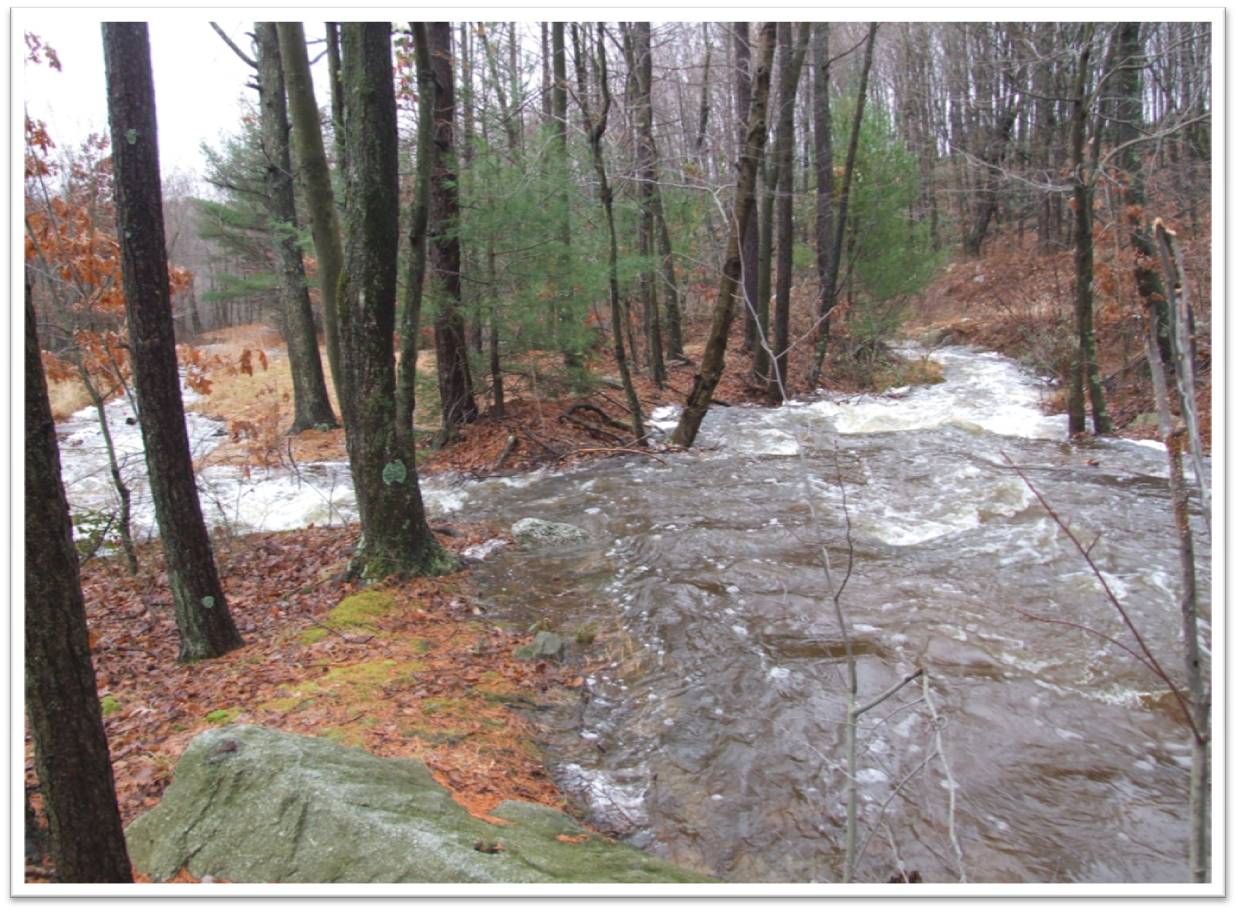 During high flow events, Wagner Run floods over its banks. The water leaving the stream channel flows into an abandoned strip mining pit and enters the underground mine pool, later exiting as AMD at the Pine Knot Discharge.