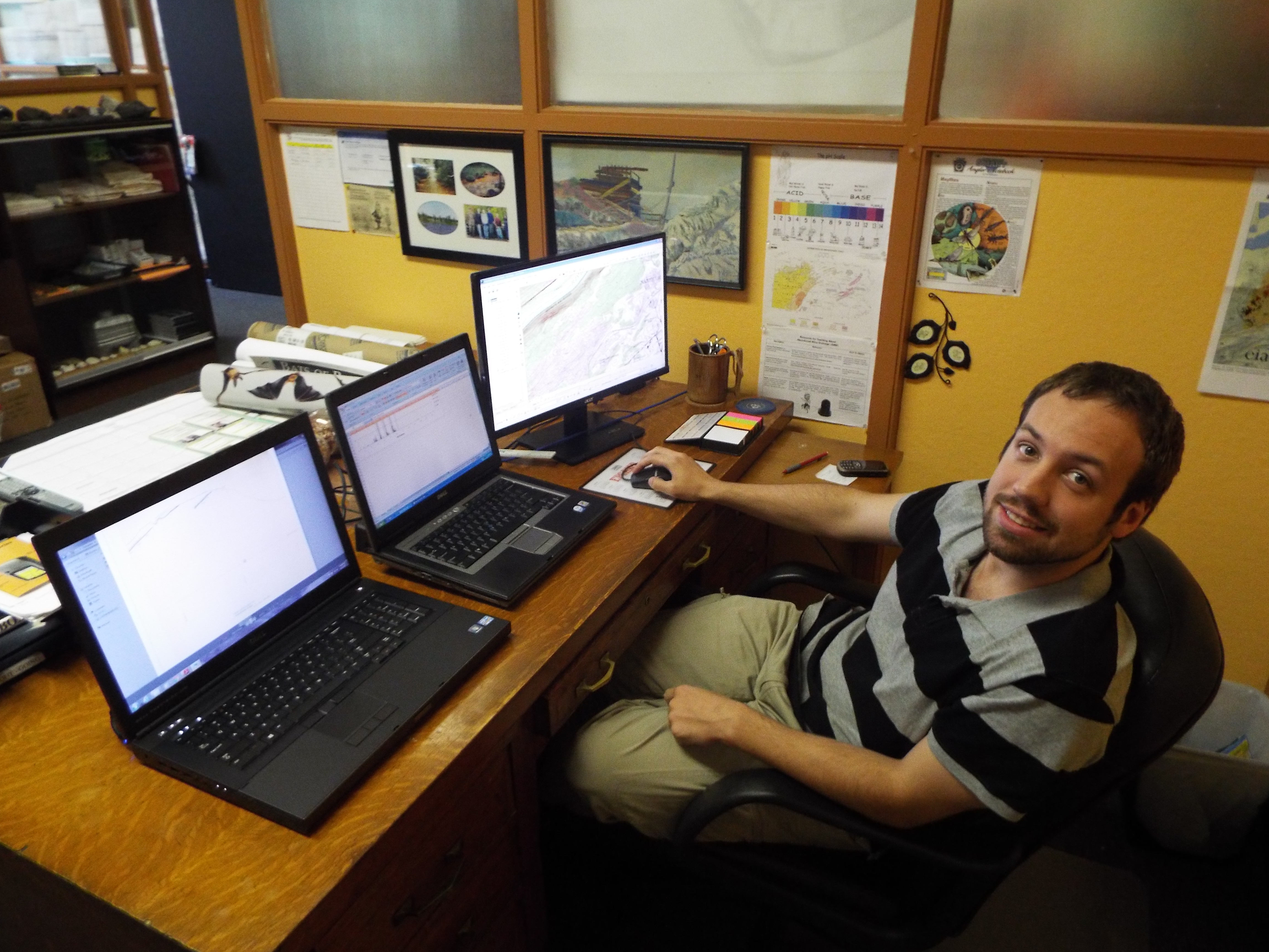 Paul Dunay III, EPCAMR’s newest Staff member working on 3 screens on his first day as our GIS Technician under our recently funded Mine Map Grant