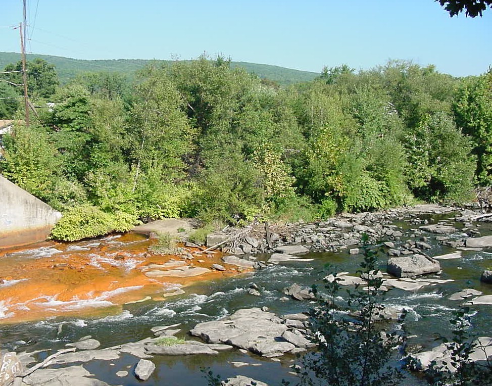 The Old Forge AMD Borehole seen looking north from the Union Street Bridge in Old Forge as it enters the Lackawanna River polluting the lower 3 miles of the watershed before entering the N. Branch of the Susquehanna River.