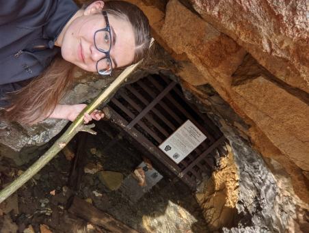 Carolyn Phillips explores one of the sealed mine entrances and bat caves along Dogtown Road on State Game Lands 260, near Shickshinny where EPCAMR is currently conducting a Coldwater Conservation Watershed Assessment in her hometown. This is one of many sites where the water was sampled for AMD impacts suspected of reaching Rocky Run. (2021)